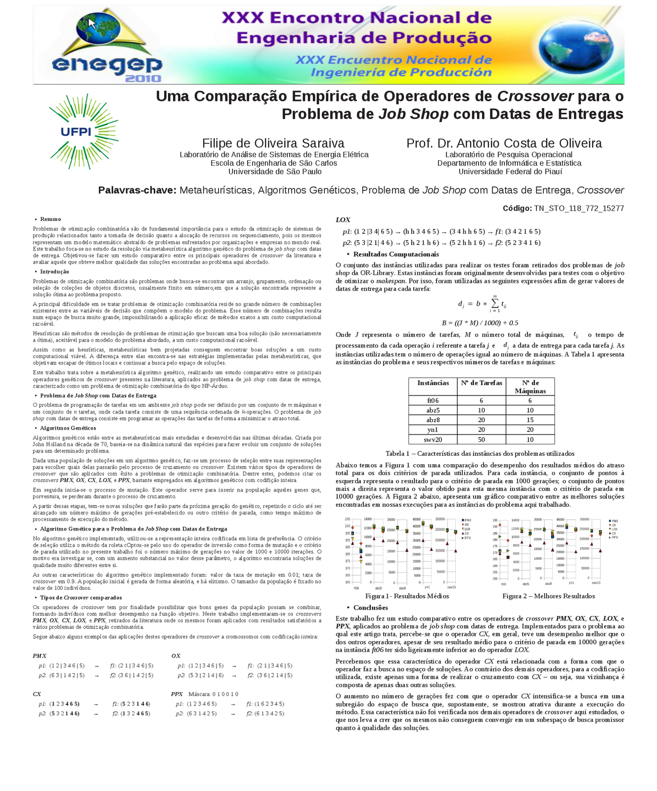 O artigo, cujo título completo é Uma Comparação Empírica de Operadores de Crossover para o Problema de Job Shop com Datas de Entrega, foi publicado nos anais do XXX ENEGEP e faz um estudo comparativo entre operadores de cruzamento de um algoritmo genético para um problema específico, o sequenciamento de tarefas em um conjunto de máquinas.
